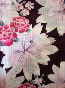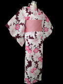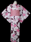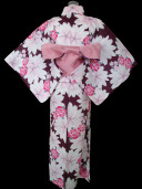 This detailed Kimono Yukata has an earthy red brown base color but is filled with many huge white flowers you can hardly see the background. The small detailed red flowers complete the design to make for a beautifully clean appearance.
