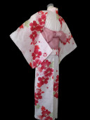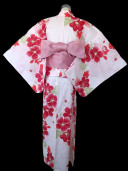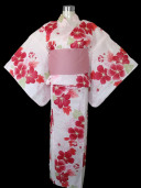 This stunning Kimono Yukata has a gorgeous pastel pink base color that is beautifully contrasted against the large dark red flower patterns. A luscious Yukata for a feminine and slightly bold appearance.