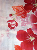 淡いピンク地に、赤い花の模様です。ゴージャスな赤い花のまわりに、バラと紅葉の模様が散りばめられていて、ロマンテックな印象に!