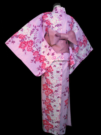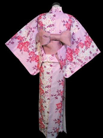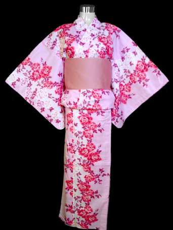 This Kimono Yukata is beautifully crafted from a light pastel pink base color and carefully decorated with an elegant selection of small rose flowers. The detail in the rose patterns is magnificent creating a delicate pink girly appearance.