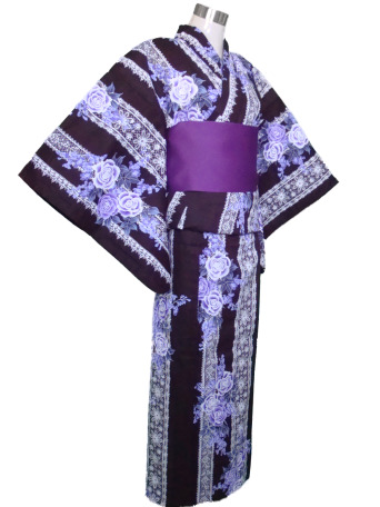 Beautifully crafted black Kimono Yukata has gorgeous detailed white lace pattern set against large vertical stripped background. Finished with beautiful white rose patterns. Perfect for a detailed and complex appearance.