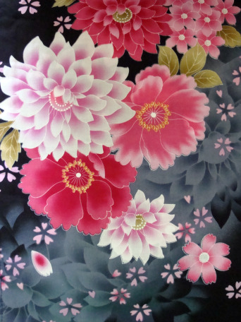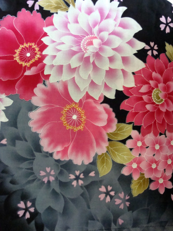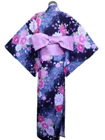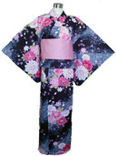 This stylish black and dark blue kimono yukata has beautifully large and detailed, pink and white flower pattern contrasted with the small and delicate pinnk sakura flowers. An elegant yukata for any occasion.