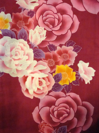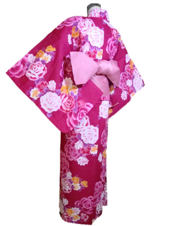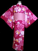 Bright maroon red yukata yukata has beautifuly crafted large white and pink rose patterns, contrasted with small and delicate white plum flower patterns. Beautiful yukata in a slightly daring and bold red.