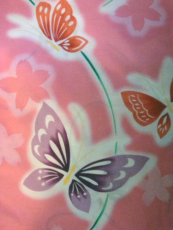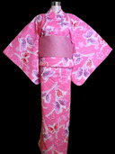 This extra cute bright pink kimono yukata has beautifully designed purple and red butterflies that float between the delicate pink sakura flowers. A wonderful yukata for a cute appearance.
