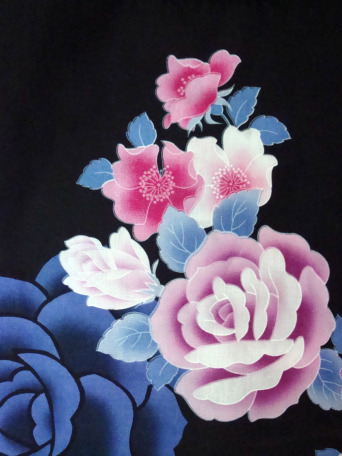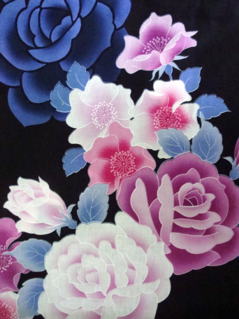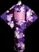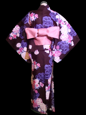Beautiful dark earthy red floral kimono yukata deccorated with large white and purple blue rose flowers contrasted with the small pink sakura flower designs. Vibrant yukata perfect for all occasions.