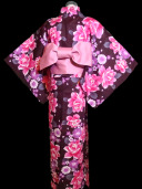 Wonderfully decorated dark maroon red kimono yukata is beautifully decorrated with large pastel pink rose flowers contrasted with small delicate purple sakura flower designs. An excellent yukata for summer festivals.