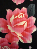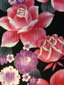 黒地に大胆な赤いバラと、そのまわりに散りばめられた紫と白い花がアクセントになっていて、とてもゴージャスな浴衣です。