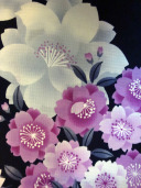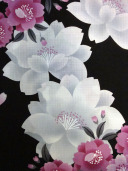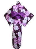 Beautiful flowery dark purple kimono yukata with large gorgeous white lily flower patterns. The pink and purple plum flowers are nestled elegantly creating a wonderful floral design.