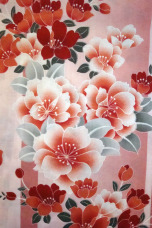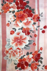 Beautiful light pastel pink base color with dark pink stripes is wonderfully decorated with reddish pink plum flowers with adorable grey petals. Perfect for a delicate pink cute appearance.