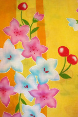 Stunning fully body yellow base color is accentuated by yellow-orange vertical stripes. The beautiful blue and pink cherry flowers look gorgeous and fit perfectly with the bight red cherries.