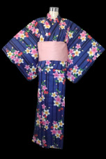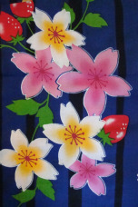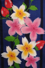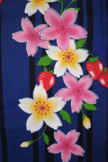 Decorative rich blue Kimono Yukata has dark stripes that fit perfectly against the large pink and white cherry blossom flower designs. Finished with bright red strawberry and green petals completes this beautiful design.