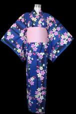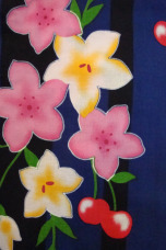 Decorative rich blue Kimono Yukata has dark stripes that fit perfectly with many pink and white cherry blossom flower abundant. Finished with bright red cherries and green petals completes this beautiful floral design.