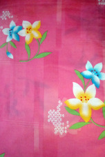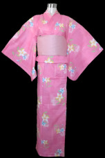 Gorgeous cute pink base color has beautiful large yellow and blue flower patterns with perfectly placed petals. Excellent yukata for a bright genki pink look.