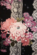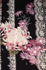 Elegant black kimono yukata has a unique lace design which is beautifully decorated with small pastel purple and pink flowers. Gorgeous yukata with complex design.