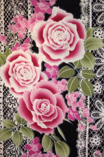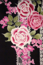 Elegant black kimono yukata has a beautiful lace design with perfectly contrasting pink rose flowers. The light green petals and pink sakura blossoms create a gorgeous yukata for all occasions.