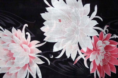 Beautiful deep black base color traditional Japanese kimono yukata imported directly from Japan with large pink and white flower patterns. The flowers have gorgeous glitter outline.