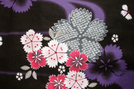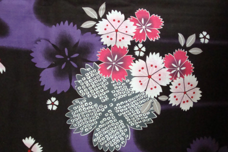 Gorgeous dark traditional Japanese kimono yukata imported directly from Japan, has a dark base color with a purple blue flowers which is beautifully contrasted against small delicate pink cherry blossom flower patterns.