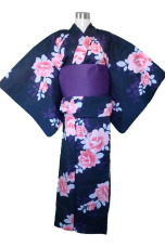 Beautiful dark blue traditional Japanese kimono yukata, imported directly from Japan has a deep dark blue base color with wonderful large pastel pink rose flower pattern, with perfect contrasting light blue leafs designs.