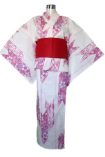 Gorgeous white traditional Japanese Kimono Yukata imported directly from Japan has a beautiful pink stripes with delicate purple, pink and white sakura flower designs. A truly unique design.