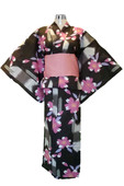 Beautiful Japanese Kimono Yukata has wonderful black base color contrasted with a large pink floral design.