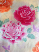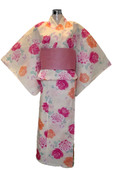 Beautiful light Japanese Kimono Yukata has wonderful light pink base color contrasted with a pink, orange and white floral design.