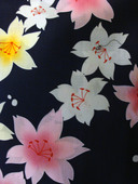 Beautiful Japanese Kimono Yukata has wonderful black base color contrasted with a cute pink, yellow & white floral design.