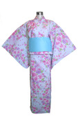 Beautiful Japanese Kimono Yukata with a light blue base color contrasting the pink and purple floral design